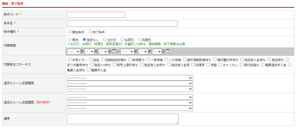 | 送付先条件 | 送付先条件を指定可能です。条件種別が開始条件の場合のみ項目が表示されます。 |