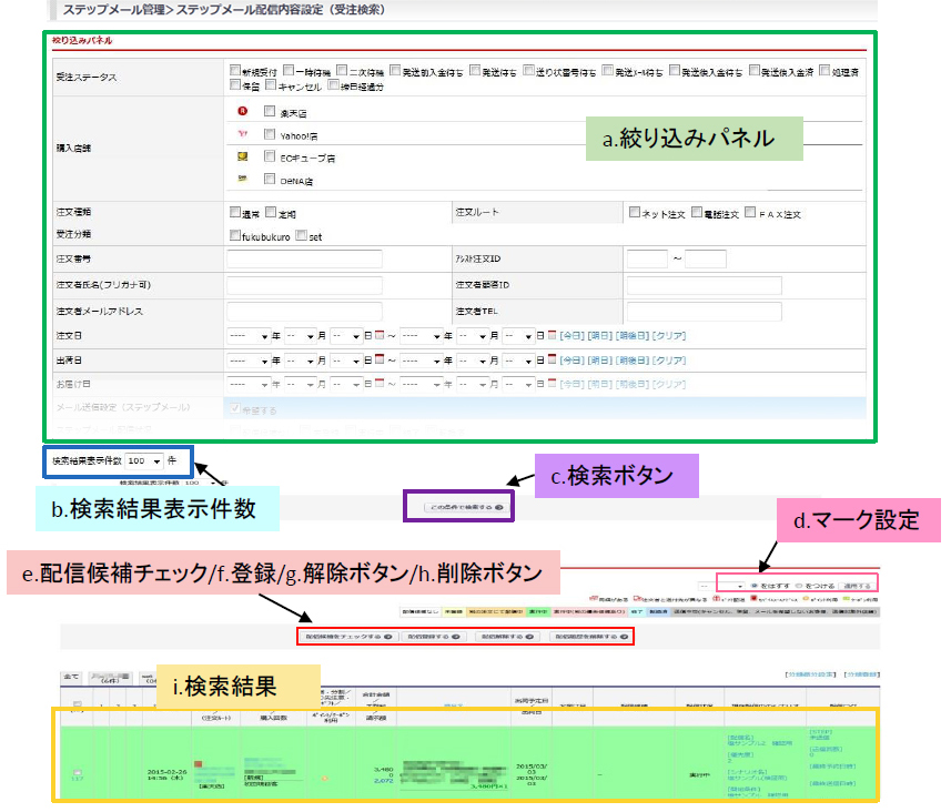 - 配信内容設定(受注検索) ※ステップメール配信候補自動設定を手動にしている場合のみ