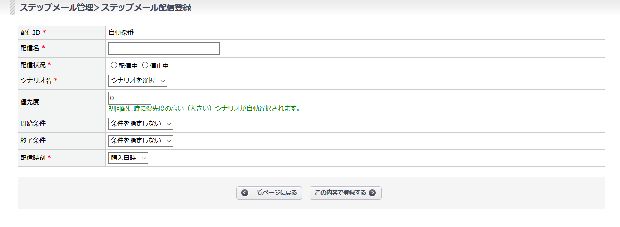 ステップメール>ステップメール配信管理>配信内容の新規登録