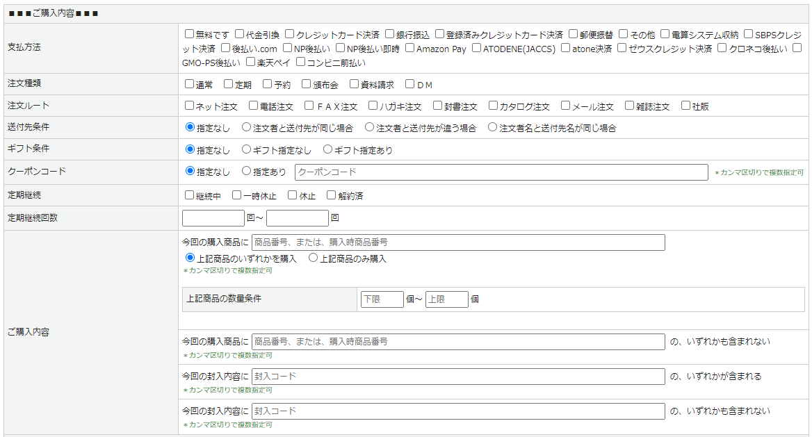 | 支払方法 | お支払方法を指定可能です。条件種別が開始条件の場合のみ項目が表示されます。※基本設定>支払方法設定で登録された支払方法が表示されます。 |