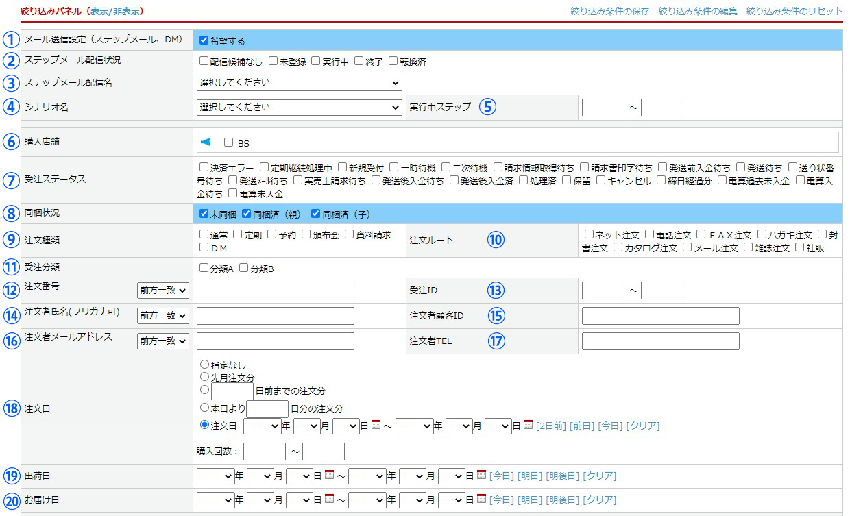 - 配信内容設定(受注検索) ※ステップメール配信候補自動設定を手動にしている場合のみ