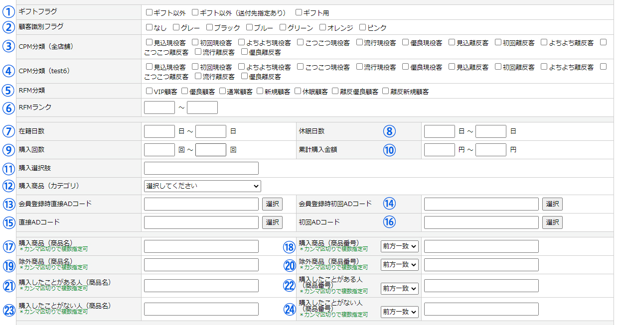 | ②顧客識別フラグ | 顧客に識別フラグをつけている場合、フラグの種類をチェック |