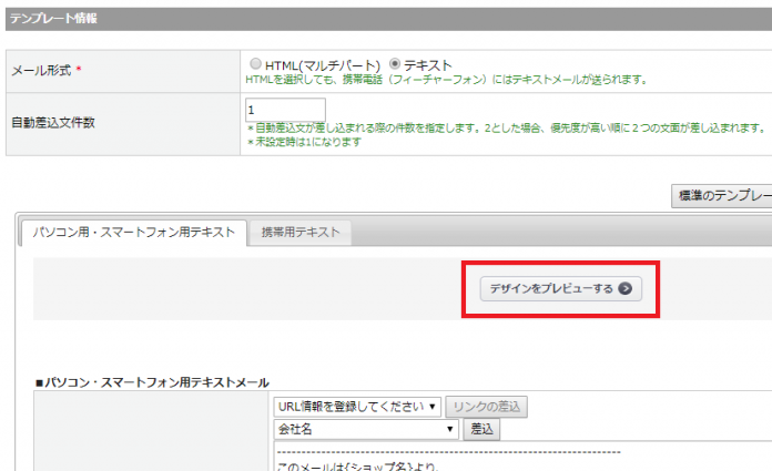 メールテンプレート登録画面にて、【デザインをプレビューする】ボタンを