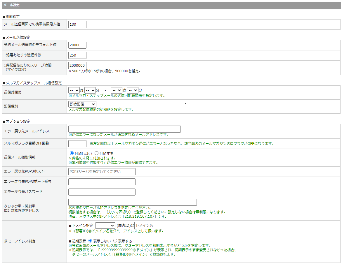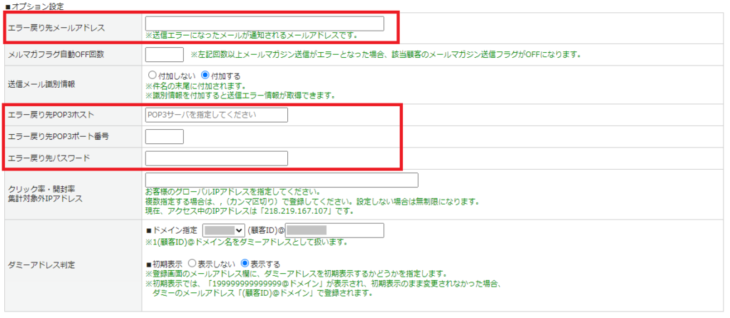 エラー戻り先メールアドレス 送信エラーになったメールが通知されるメールアドレスの設定です。