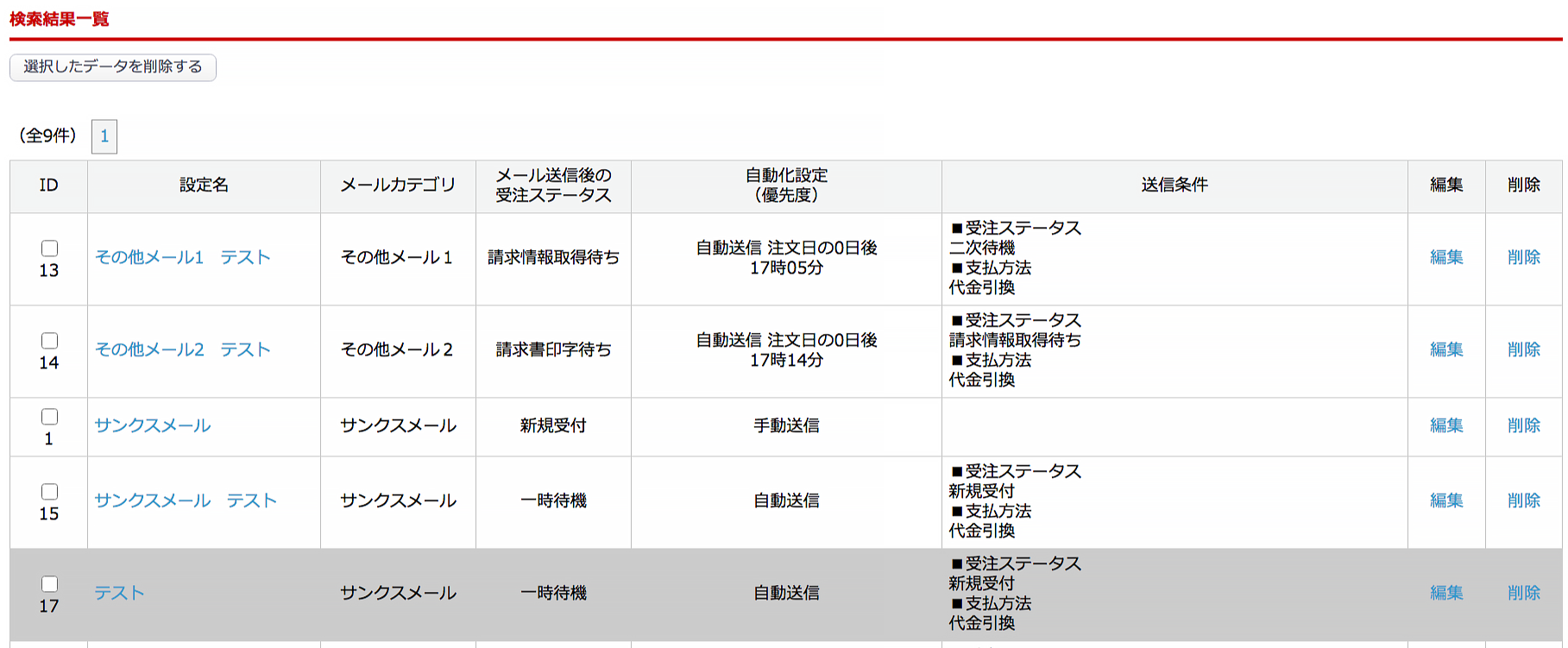| 編集 | 「編集」をクリックすると、受注管理用メール送信設定登録画面の「メール送信設定」に遷移します。メール送信登録の確認や、編集が可能です。 |
