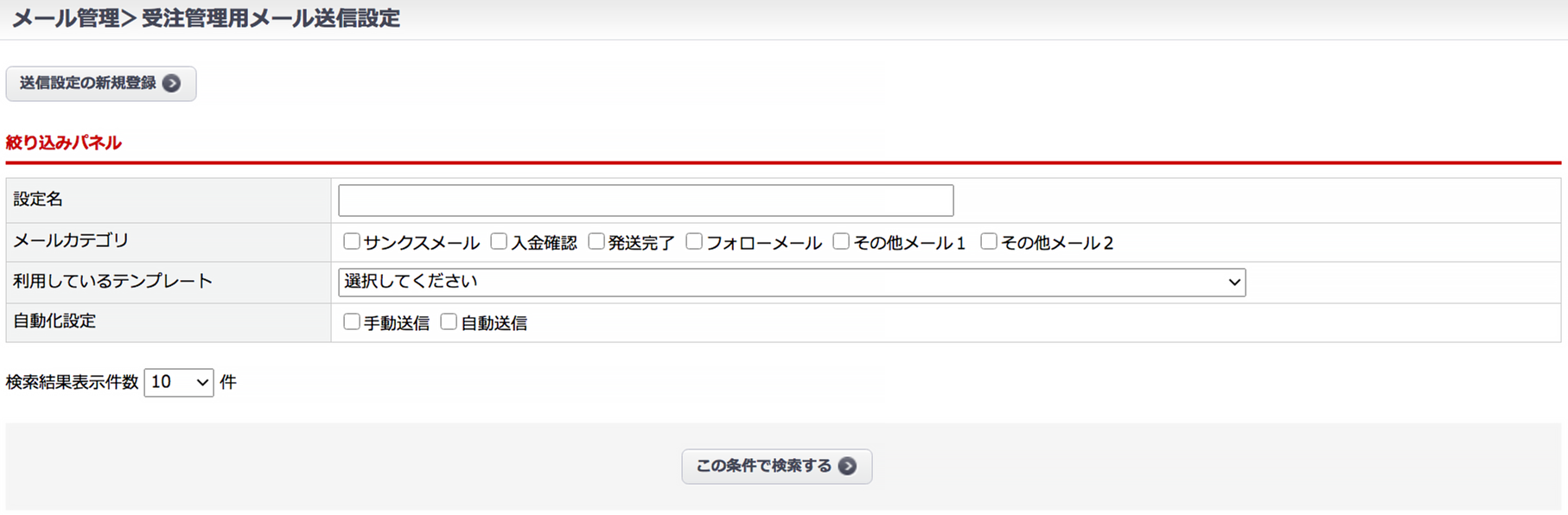 登録済の受注管理用メール送信設定を絞り込み条件で検索し、【この条件で検索する】ボタンをクリックすることで、一覧で確認できます。