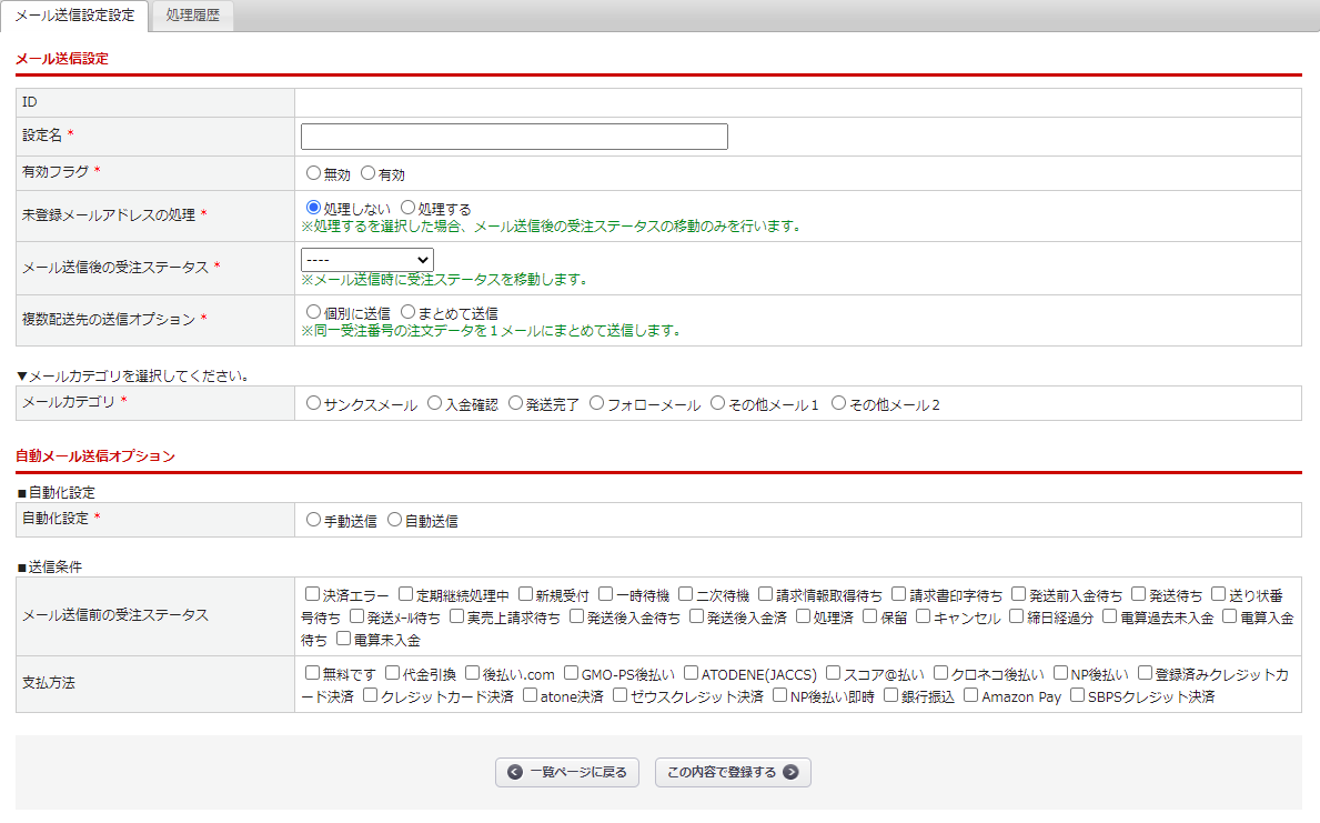 ・メールカテゴリが「サンクスメール」のとき ・メールカテゴリが「発送完了」のとき ・メールカテゴリが「入金確認」のとき ・メールカテゴリが「サンクスメール」「発信完了」「入金確認」以外のとき |