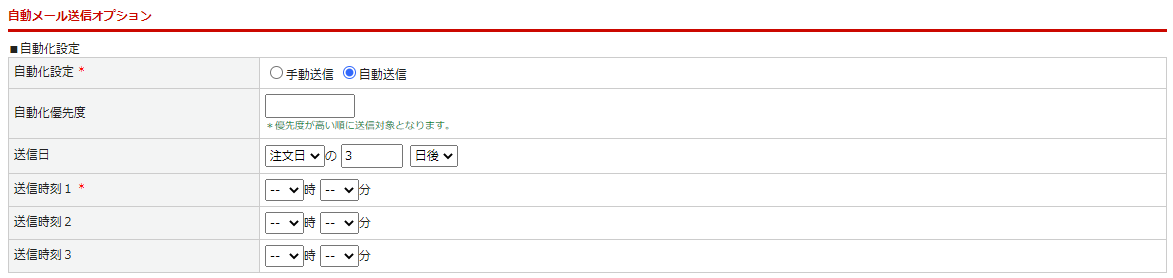 | 自動化設定(優先度) | 自動送信の設定。優先度が高い順に送信対象となります。 |