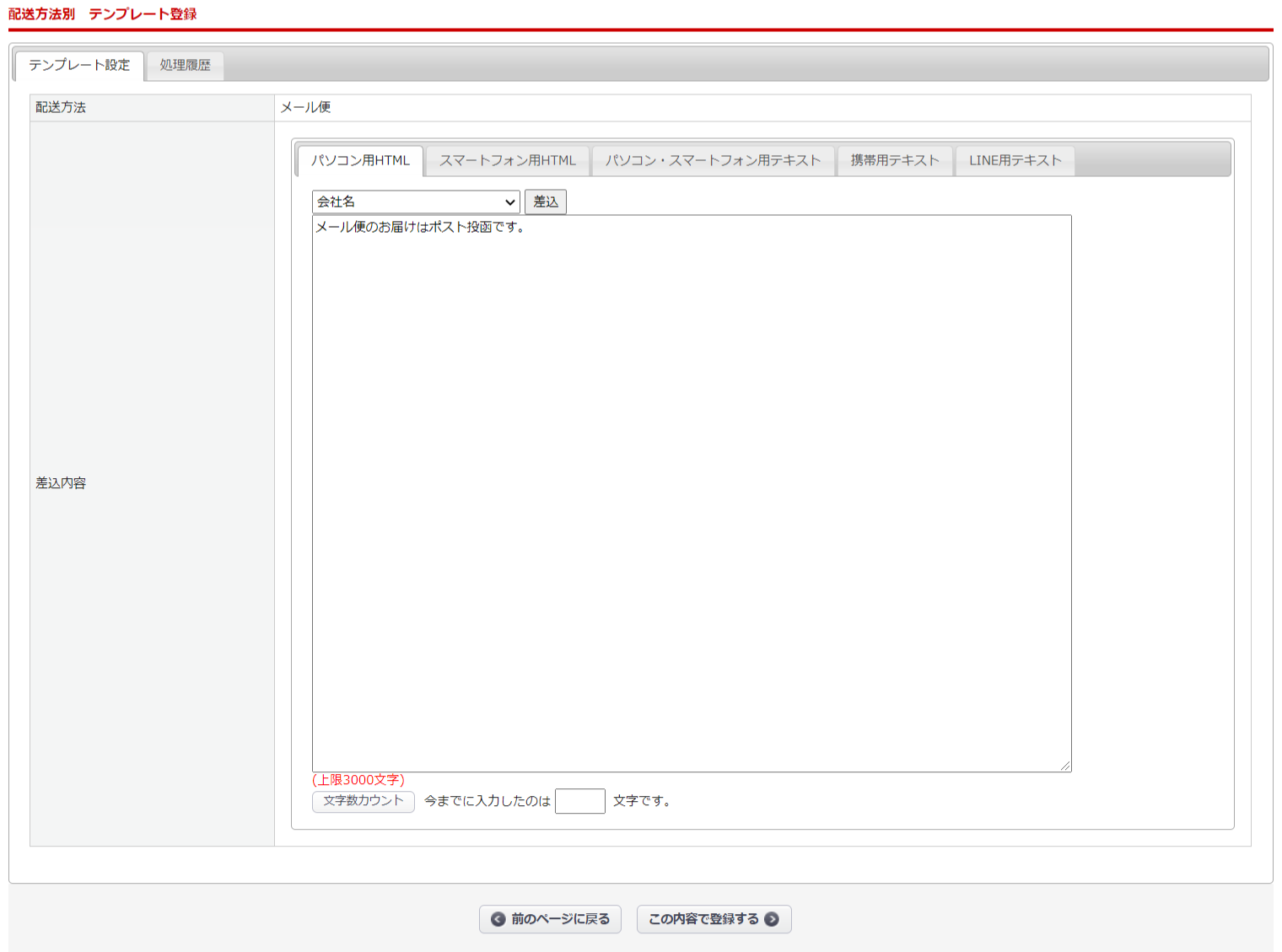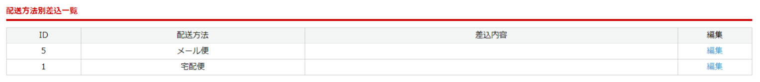 各配送方法の「編集」リンクをクリックし、差込内容を登録してください。