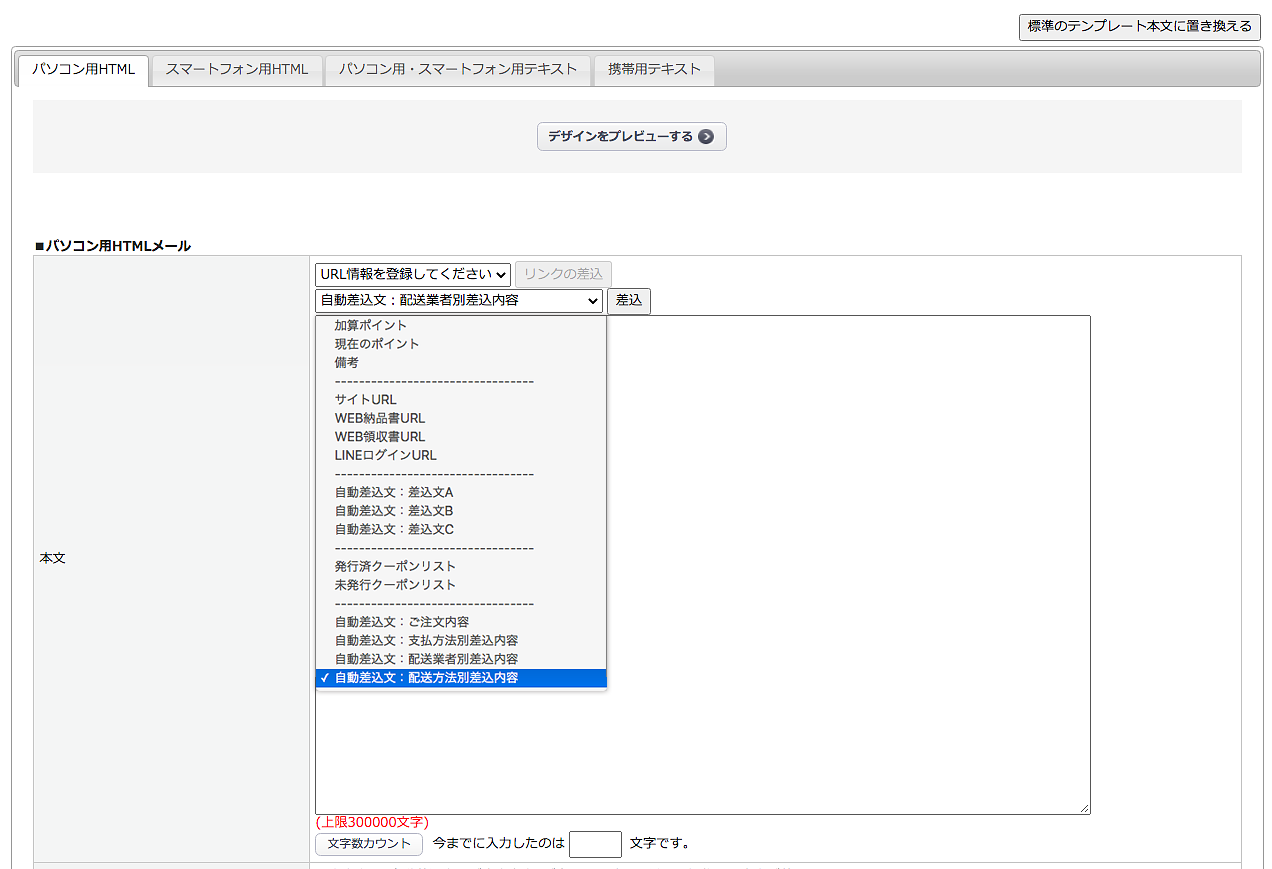 テンプレートに「自動差込文:配送方法別差込内容」を差し込み、【デザインをプレビューする】ボタンをクリックして内容の確認ができます。