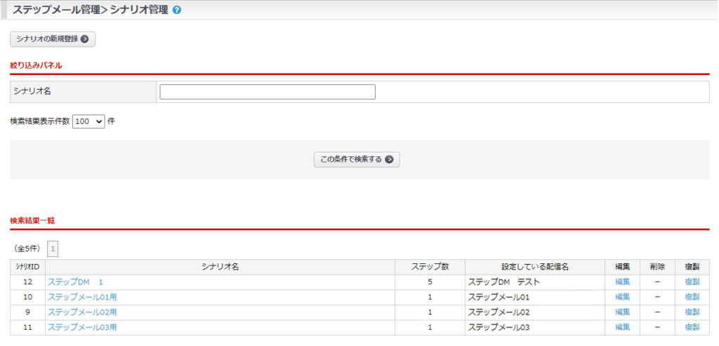 削除 「削除」をクリックすると、シナリオが削除されます。 ※配信中は「 – 」が表示され削除できません