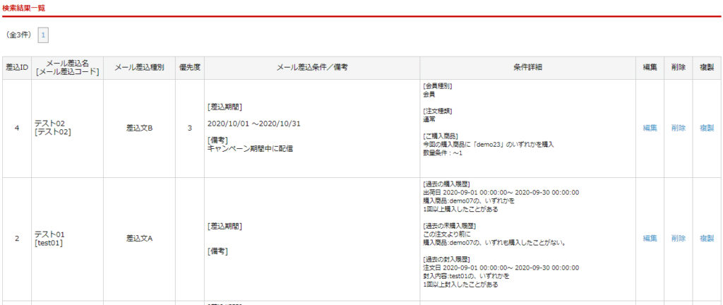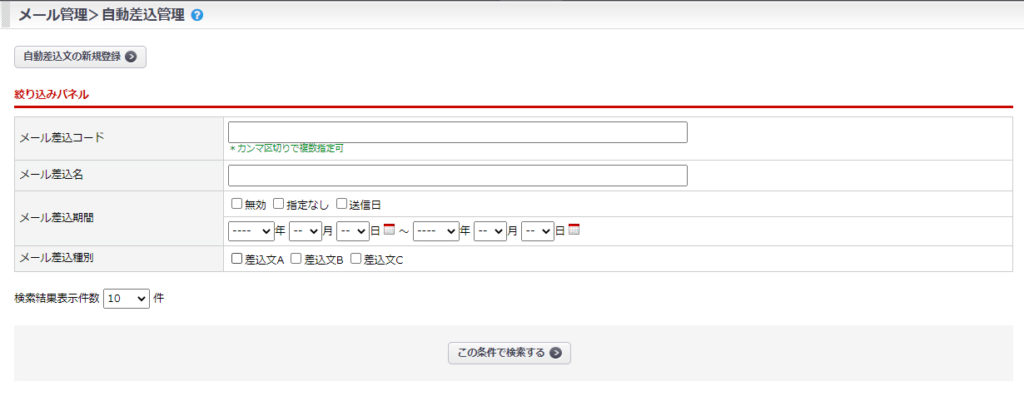 | 条件詳細 | 自動差込登録時に設定したメール差込条件の詳細 |