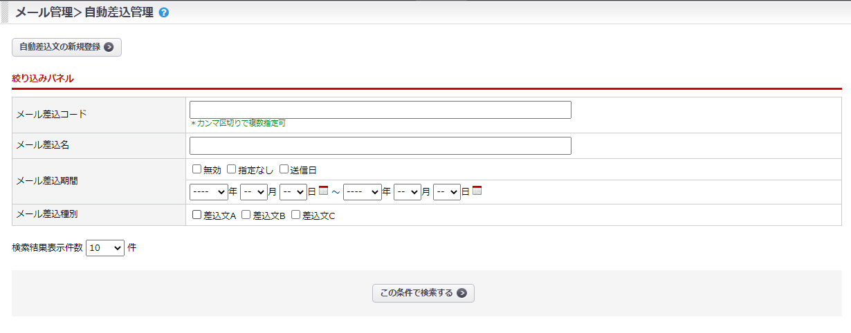 | 条件詳細 | 自動差込登録時に設定したメール差込条件の詳細 |