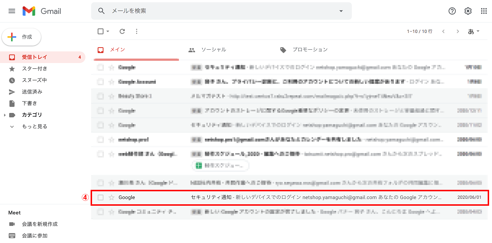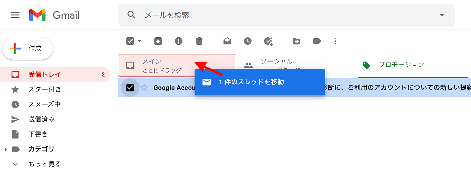 ②「メイン」タブへ移動したいメールを選択、ドラックします。