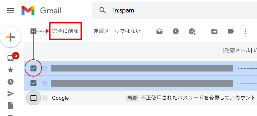 すぐに完全に削除したい場合は、削除したいメールにチェックをし、【完全に削除】ボタンをクリックして下さい。