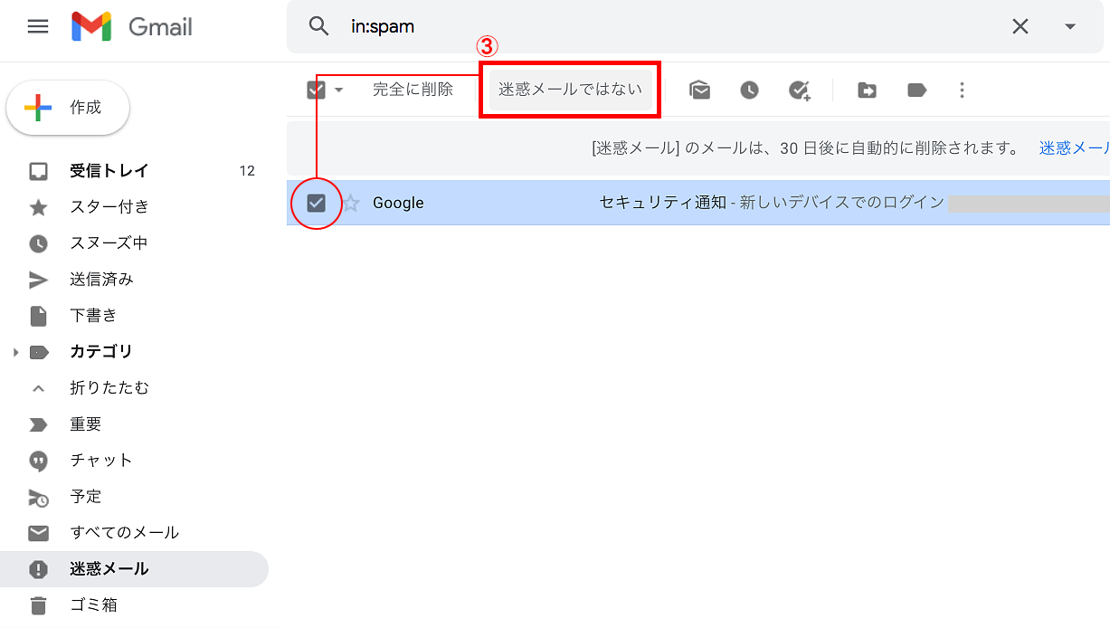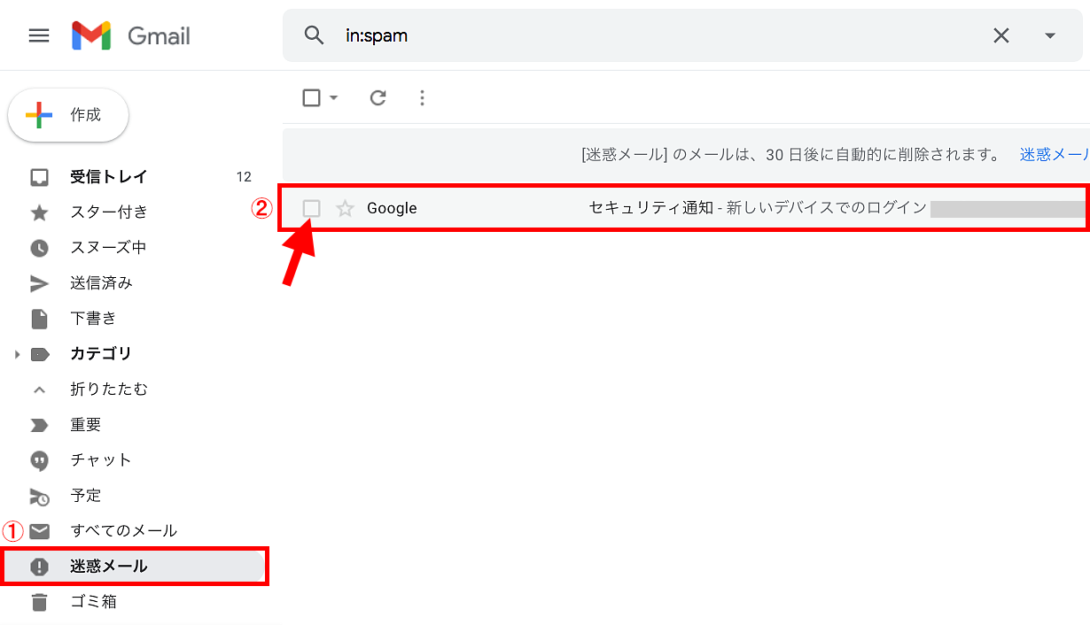 ①「迷惑メールフォルダ」を選択し、②解除したいメールのチェックボックスを選択します。