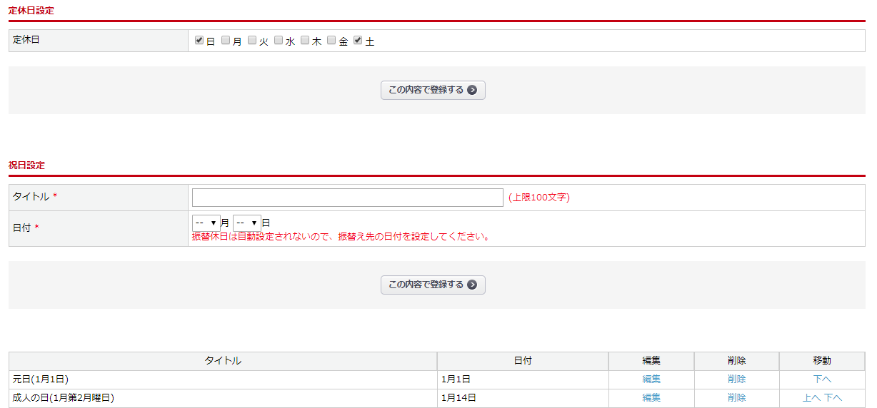 [運営>定休日管理 ]を開き、 定休日や祝日(非営業日)を登録をします。