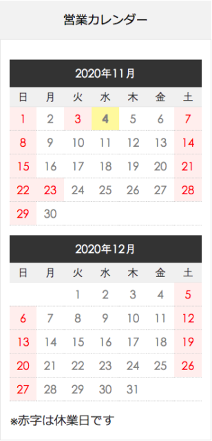 本画面で定休日・祝日の設定を行うと、サイト上のカレンダーに反映されます。