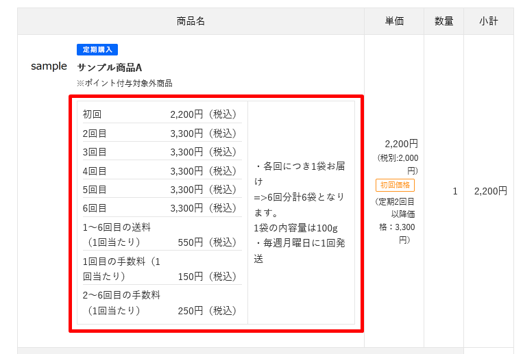 初回の送料と手数料は通常商品と定期商品を購入した際に実際にかかる金額が利用されます。