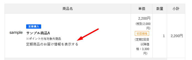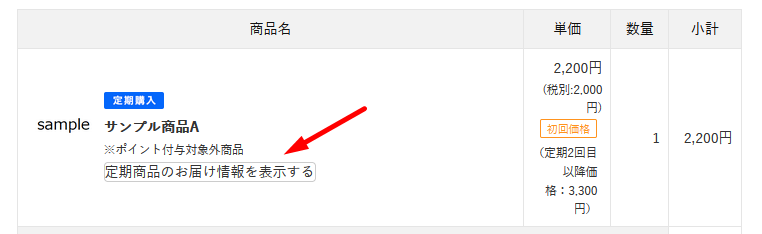 未設定の場合にはボタン名称として「定期商品のお届け情報を表示する」が表示されます。