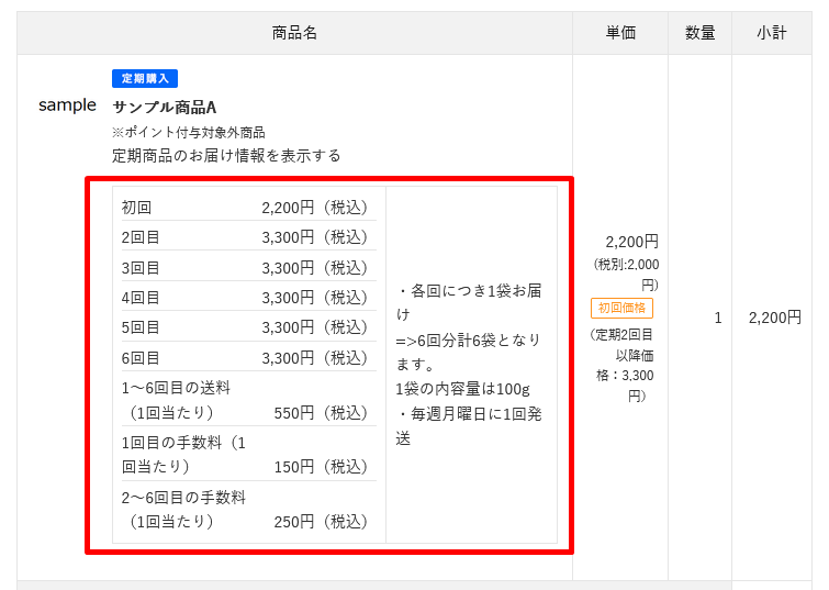 2~6回目以降:商品金額3,300円、送料550円、手数料250円