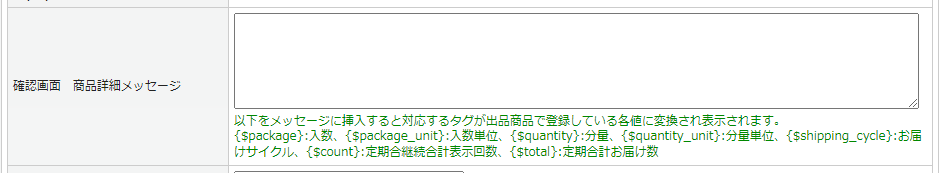 | {$package_unit} | 商品の入数単位(個、袋など) ※出品商品登録画面にて設定可能 |