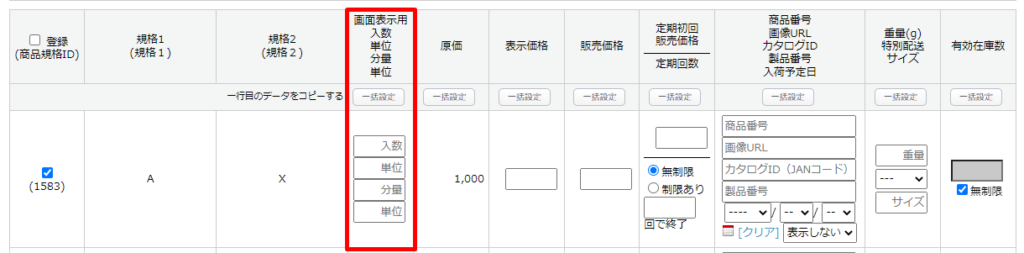 商品の入数、入数単位、分量、分量単位は出品商品登録画面の「基本情報]タブにて設定します。