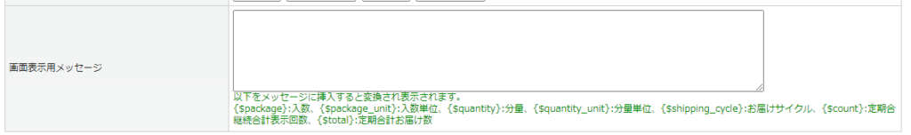 特定の商品のみ表示内容を変えたい場合、各商品登録画面より「画面表示用メッセージ」にて個別に設定することができます。