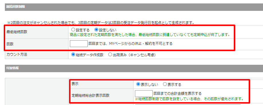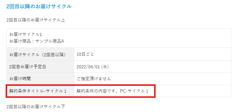 確認画面に表示されるお届けサイクルの「タイトル」「契約期間、解約条件及び方法表示内容」を設定します。