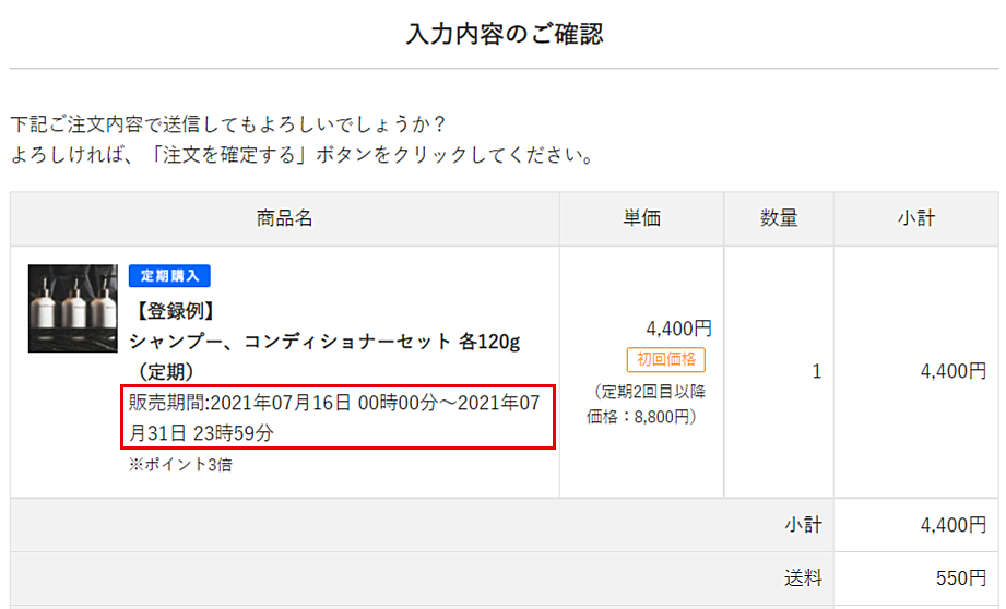 購入フローの入力内容のご確認画面とアップセル時の購入確認画面で、販売期間の表示が可能です。