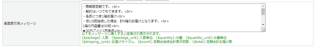 商品詳細メッセージ、各回のお支払額、定期継続総合計に適用される表示回数は、