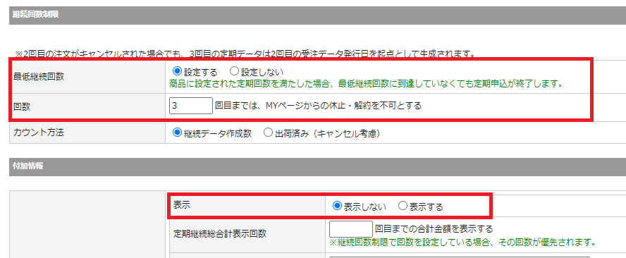定期継続総合計表示回数が未設定の場合には、最低継続回数が表示回数として適用されます。