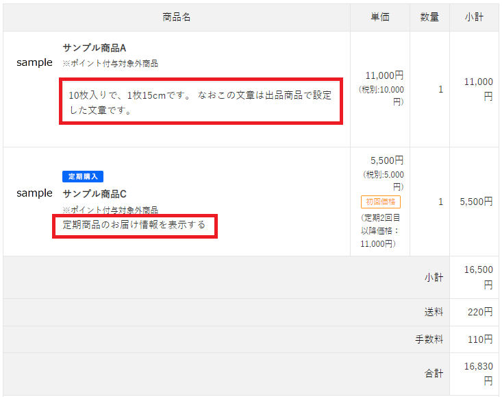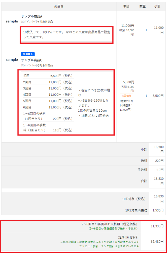 - 入力内容のご確認画面の定期総合計の金額について、リピート割引・ランク割引・ロット割引・まとめ割引など各種割引が加味されない金額で表示されます。こちらは仕様となるため、割引後の金額を表示したい場合や、割引について言及したい場合は、次の場所に追記ください。