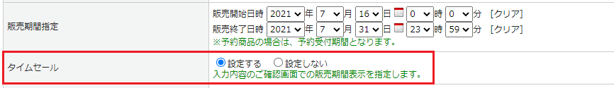 - 販売期間指定で日付を入力し、タイムセールの「設定する」ラジオボタンを選択します。