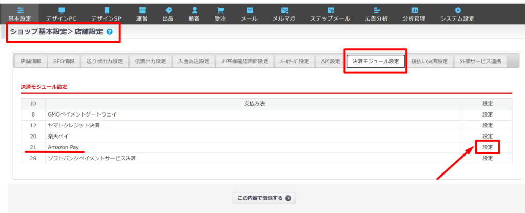 >支払方法ID:21 Amazon Payの右端 「設定」