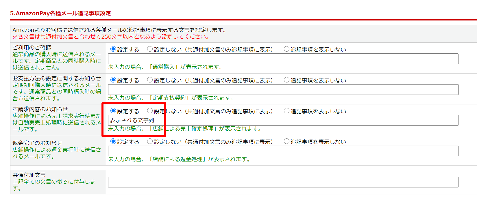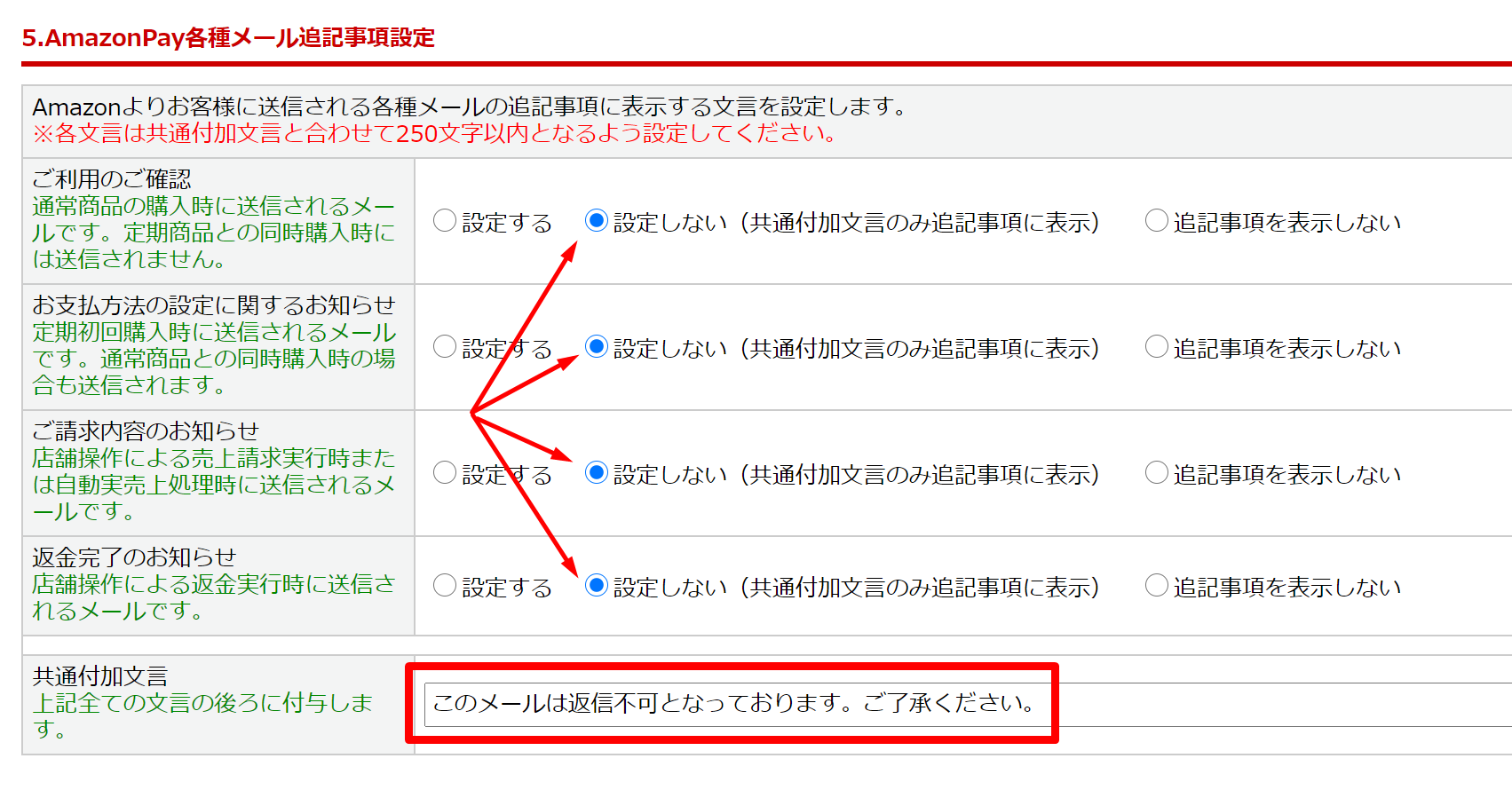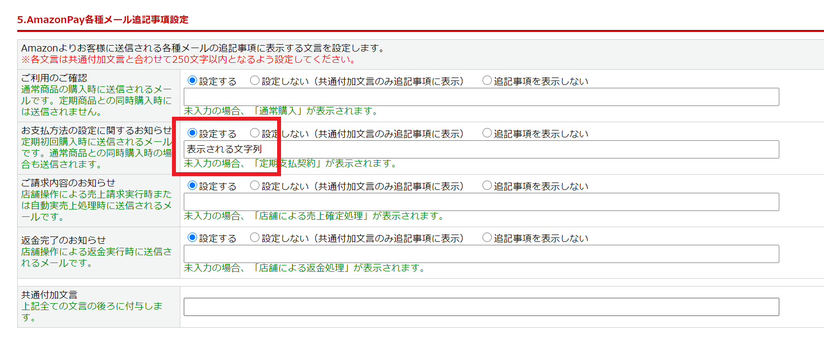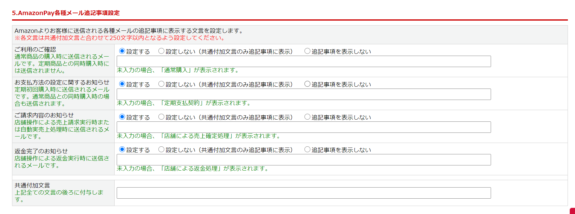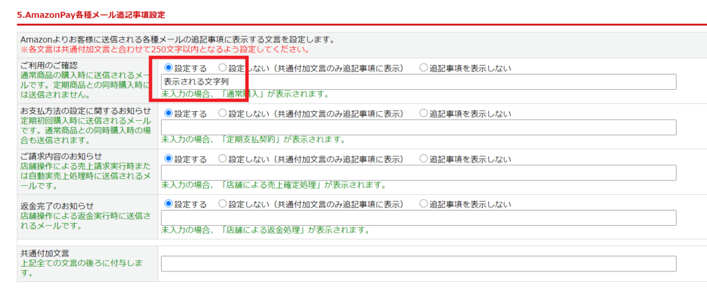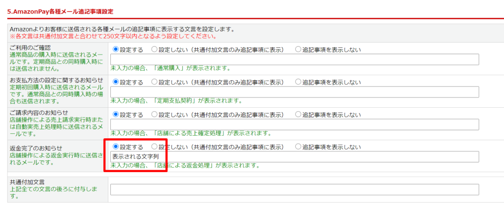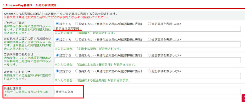 AmazonPay設定>「5.AmazonPay各種メール追記事項設定」