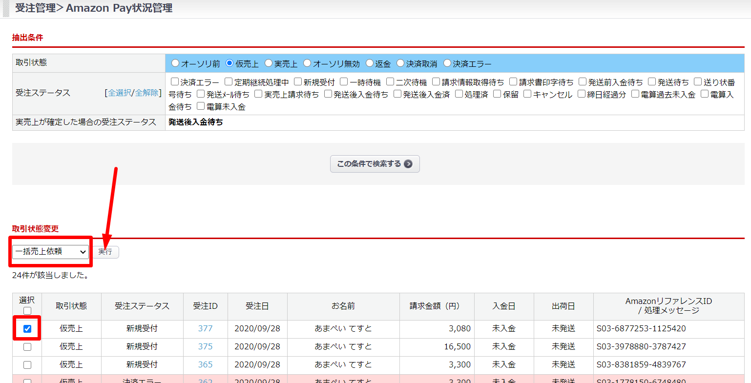 • 受注>AmazonPay状況管理 からの一括売上依頼