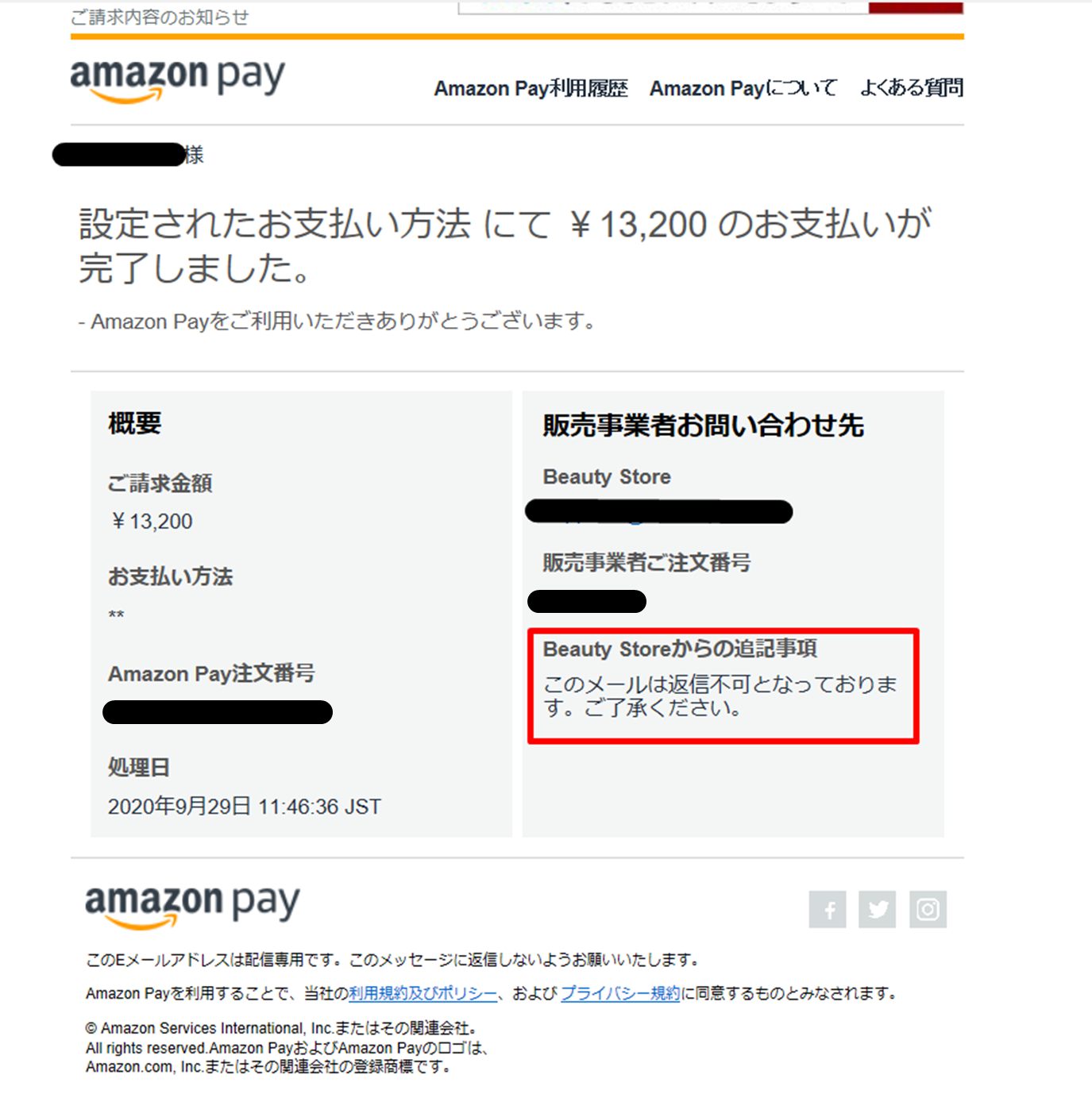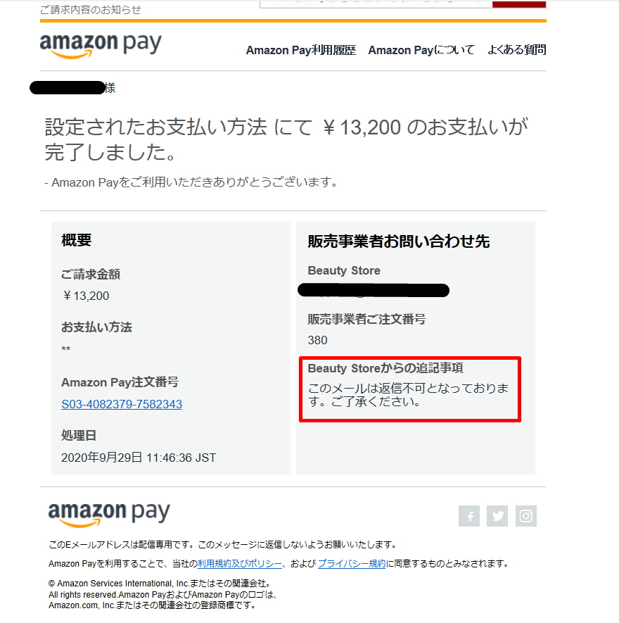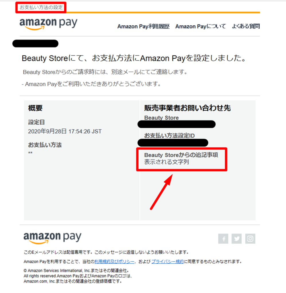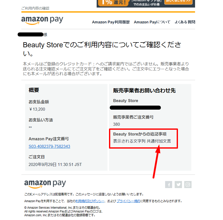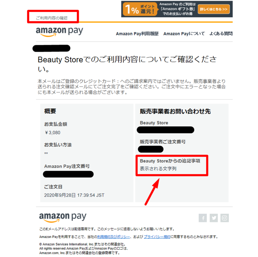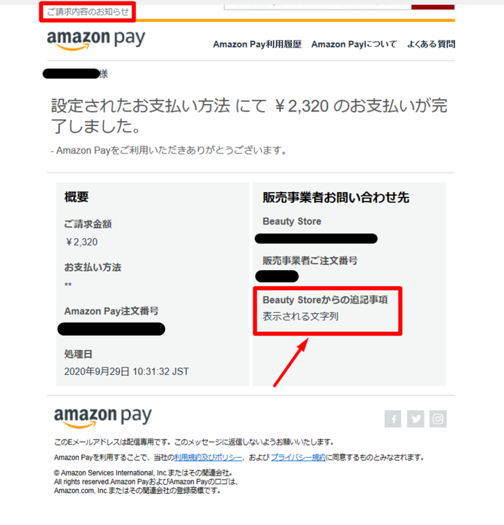 AmazonPayでの決済時、Amazonよりユーザーに自動送信されるメールの「店舗からの追記事項」欄に