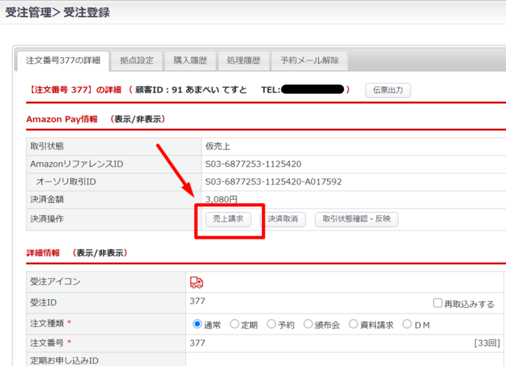 受注>受注編集画面>AmazonPay情報欄 【売上請求】ボタン