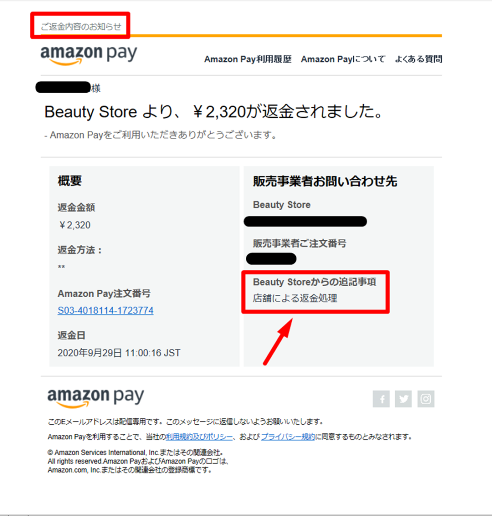 AmazonPayより「Amazon Pay 返金完了のお知らせ」メールが注文者へ自動送信されます。