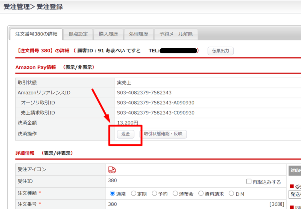 受注>受注編集画面>AmazonPay情報欄【返金】ボタン