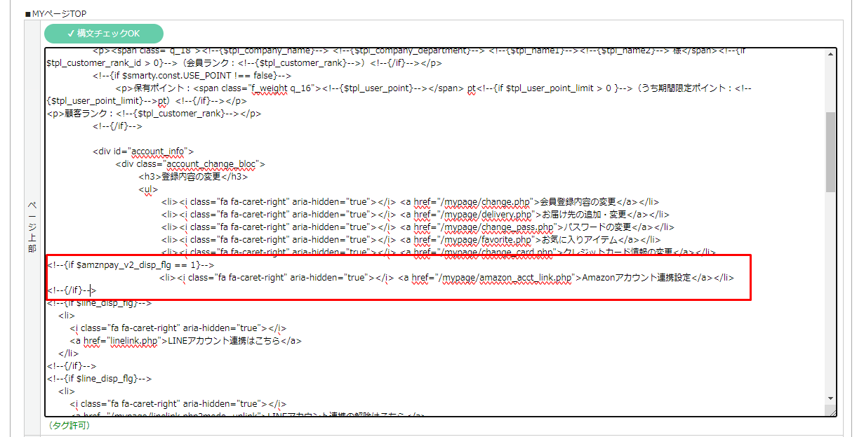 この項目に下記の記述を設定すると、MYページにリンクが表示されます。