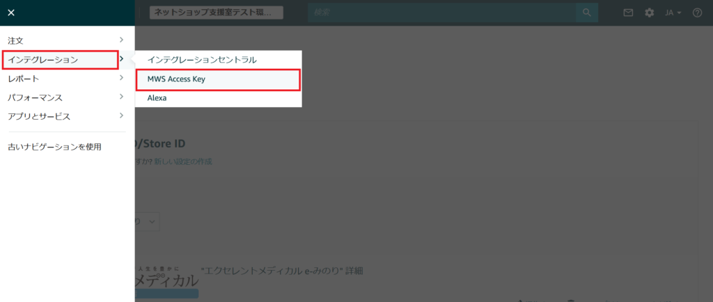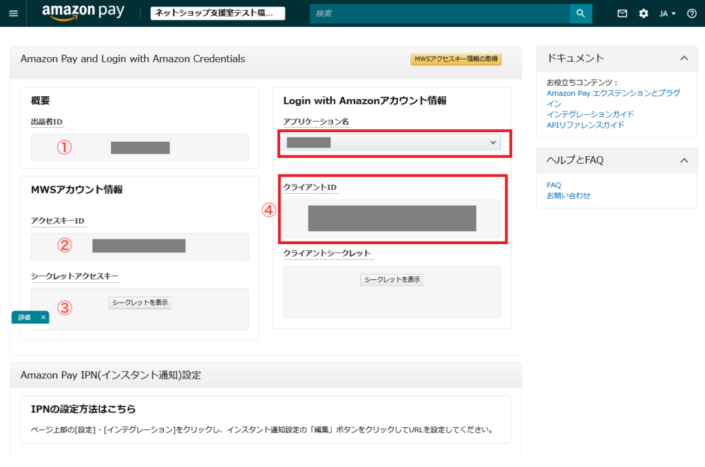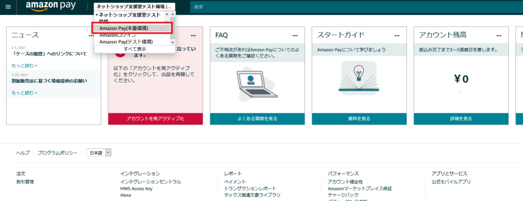 1)右上部のプルダウンから「Amazon Pay(本番環境)」を選択。