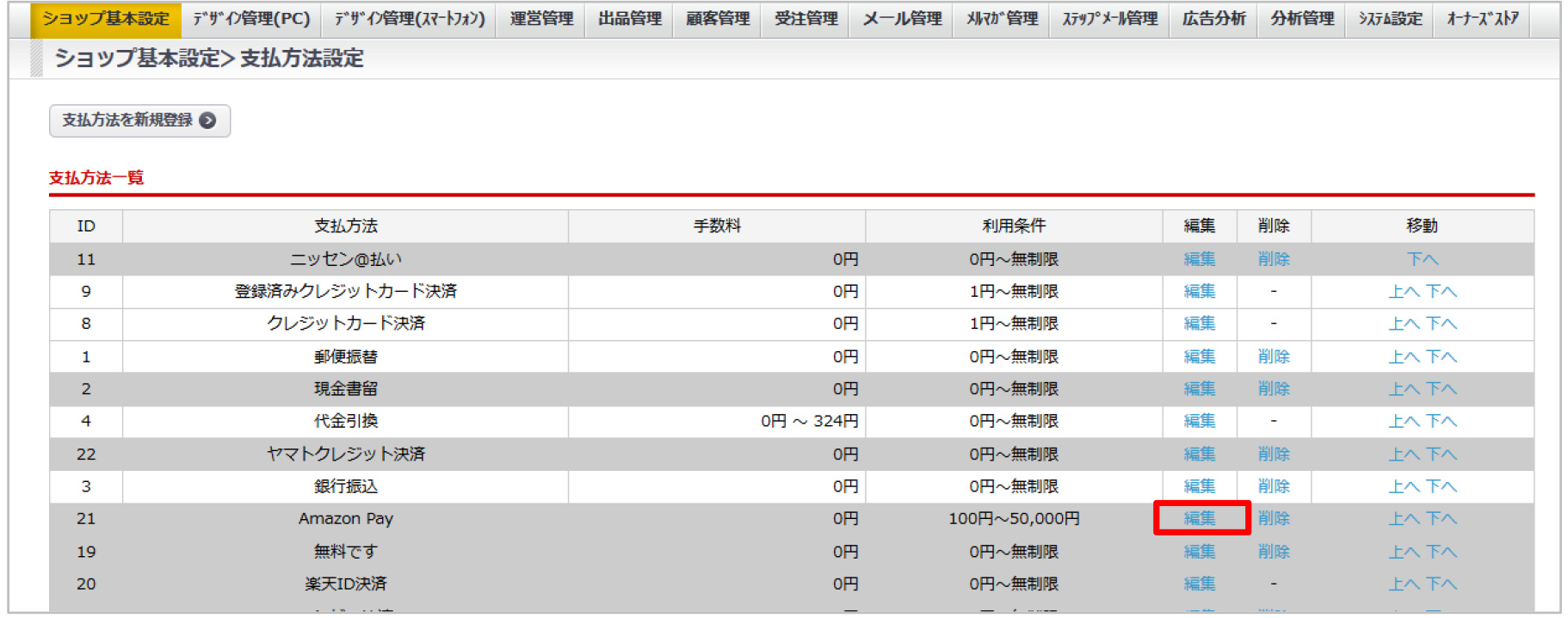1)ショップ基本設定>支払方法設定 のAmazon Payの「編集」をクリックし、支払方法登録・編集画面へ遷移。