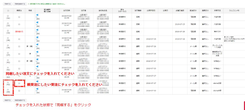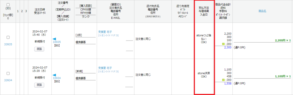 ※atoneつど後払い決済の受注は「つど後払い」の欄にチェックが入っています