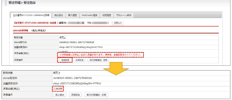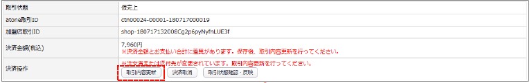 注文者(注文者または送付先)情報、決済金額の両項目に変更があった場合は【取引内容更新】ボタンより変更内容をatoneに連携します。