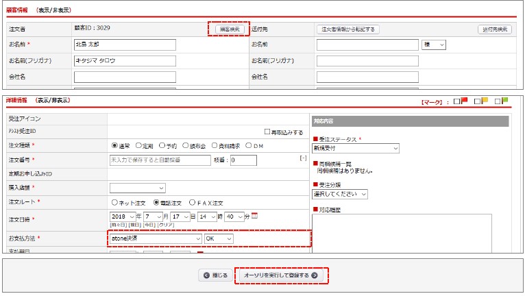 ※過去にフロントからatone決済での購入履歴がない顧客は受注登録画面でatone決済,及びatoneつど後払い決済を利用することはできません。