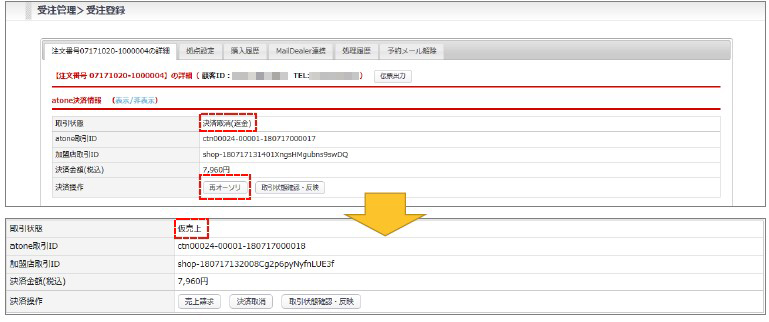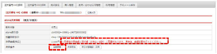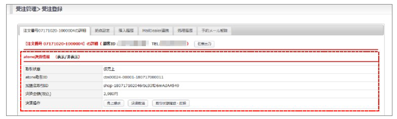 • 受注登録画面上部に「atone決済情報」が表示されます。