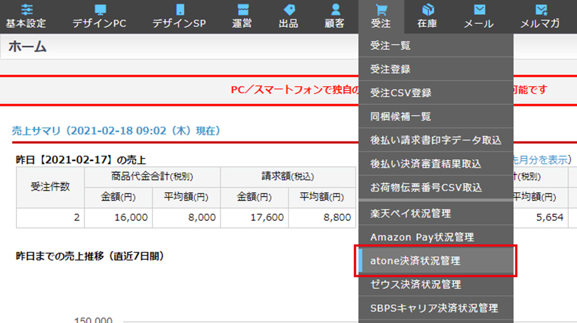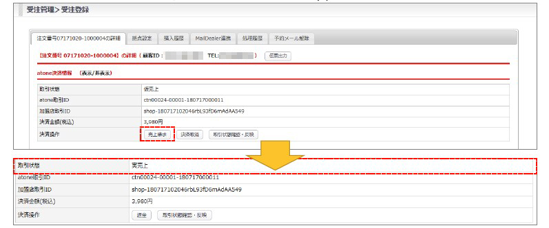 受注管理> atone 決済状況管理から売上請求(実売上)処理を行う場合