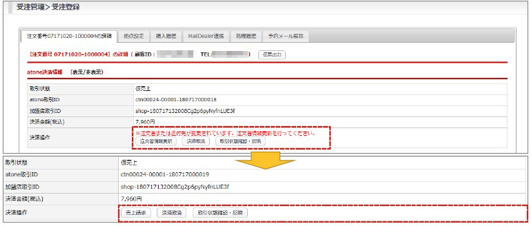 • 決済操作:該当受注に対し、atone側にリクエスト可能な決済操作が表示されます
